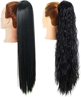 YMHPRIDE 2 pièces 28 pouces de long Extension de cheveux de queue de cheval droite et bouclée noire enveloppant les extensions de queue de cheval Clip synthétique en postiche pour les femmes