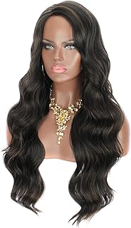 Kalyss 28' Yaki Perruques de Cheveux Synthétiques pour les Femmes Long Corps Ondulé Bouclés Perruques L Séparation Aspect Naturel (Black Brown Highlights)
